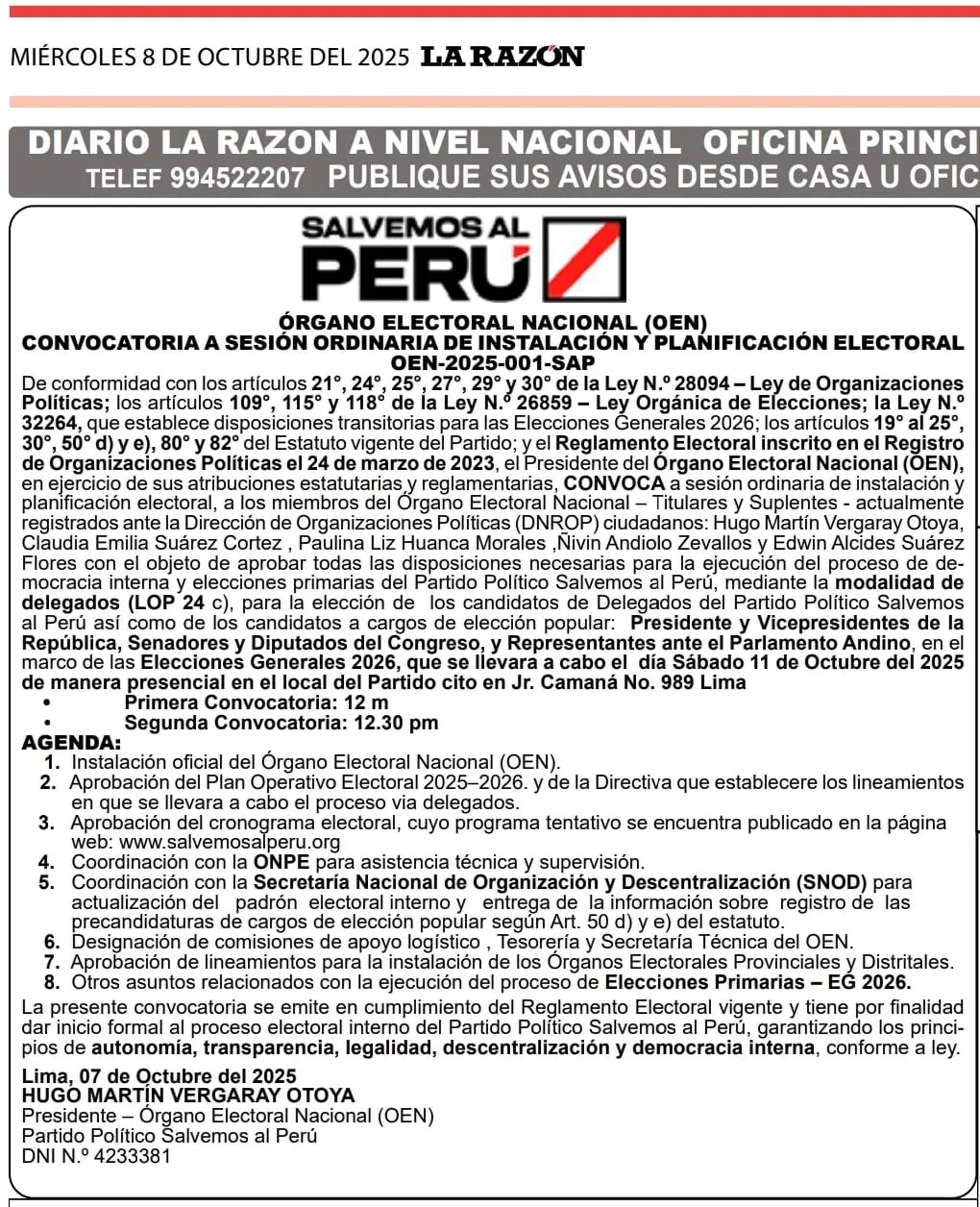 El Presidente del Órgano Electoral Nacional (OEN), Hugo Martín Vergaray Otoya, ha procedido a convocar a sesión ordinaria de instalación y planificación electoral del Proceso de elección de los candidatos a cargos de elección popular para las Elecciones Generales del 2026 (EG2026) que se llevará a cabo el Sábado 11 de Octubre del 2025, en el local del Partido Político Salvemos al Perú, cito en Jr. Camaná No. 989- Lima