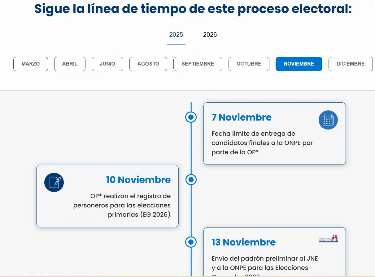 El 10 de Noviembre del 2025, vence el plazo para que Organizaciones Políticas registren a los personeros de las mesas de votación para la elecciones primarias.