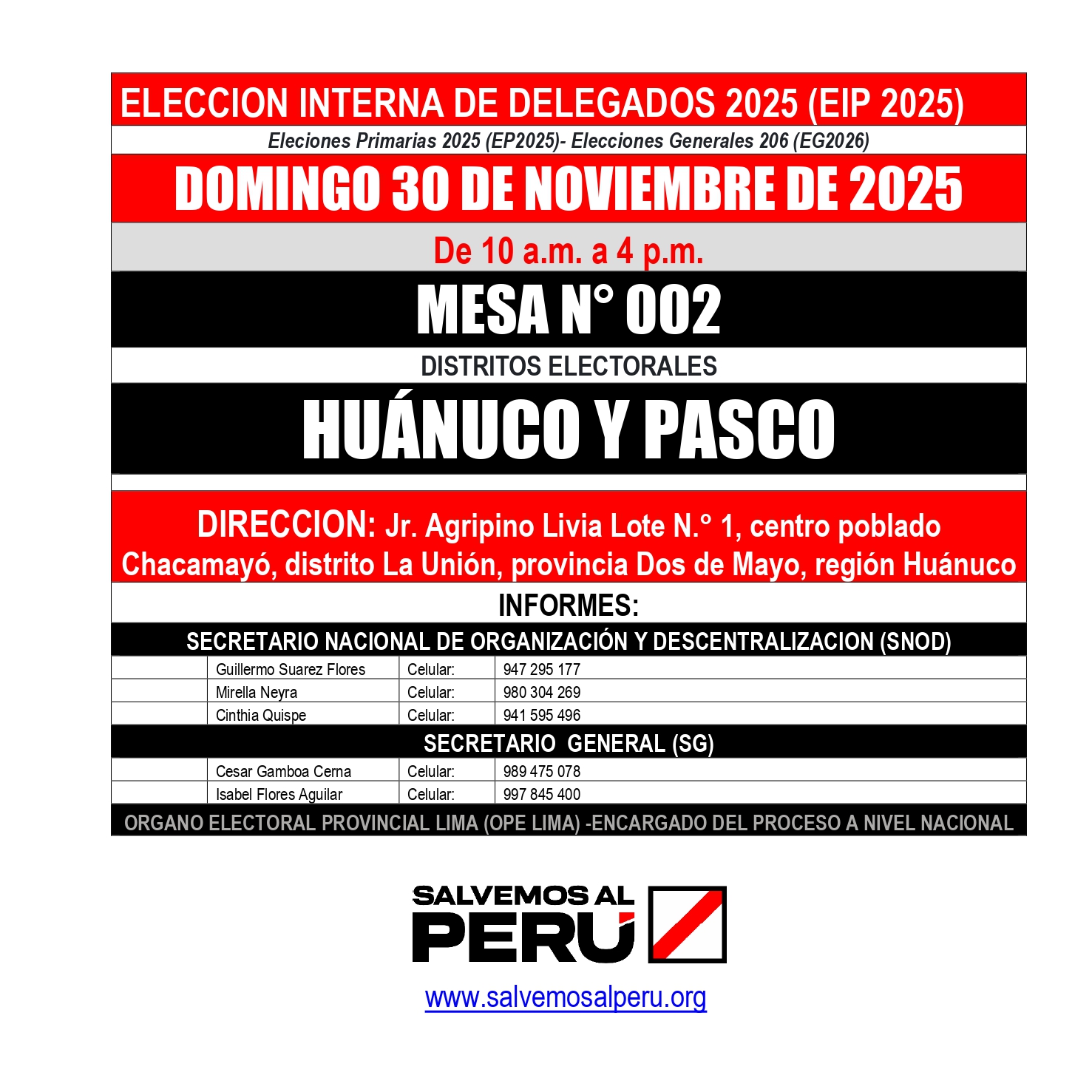 - CENTRO-2: MESA No. 002 Huánuco y Pasco – elige 2 delegados.