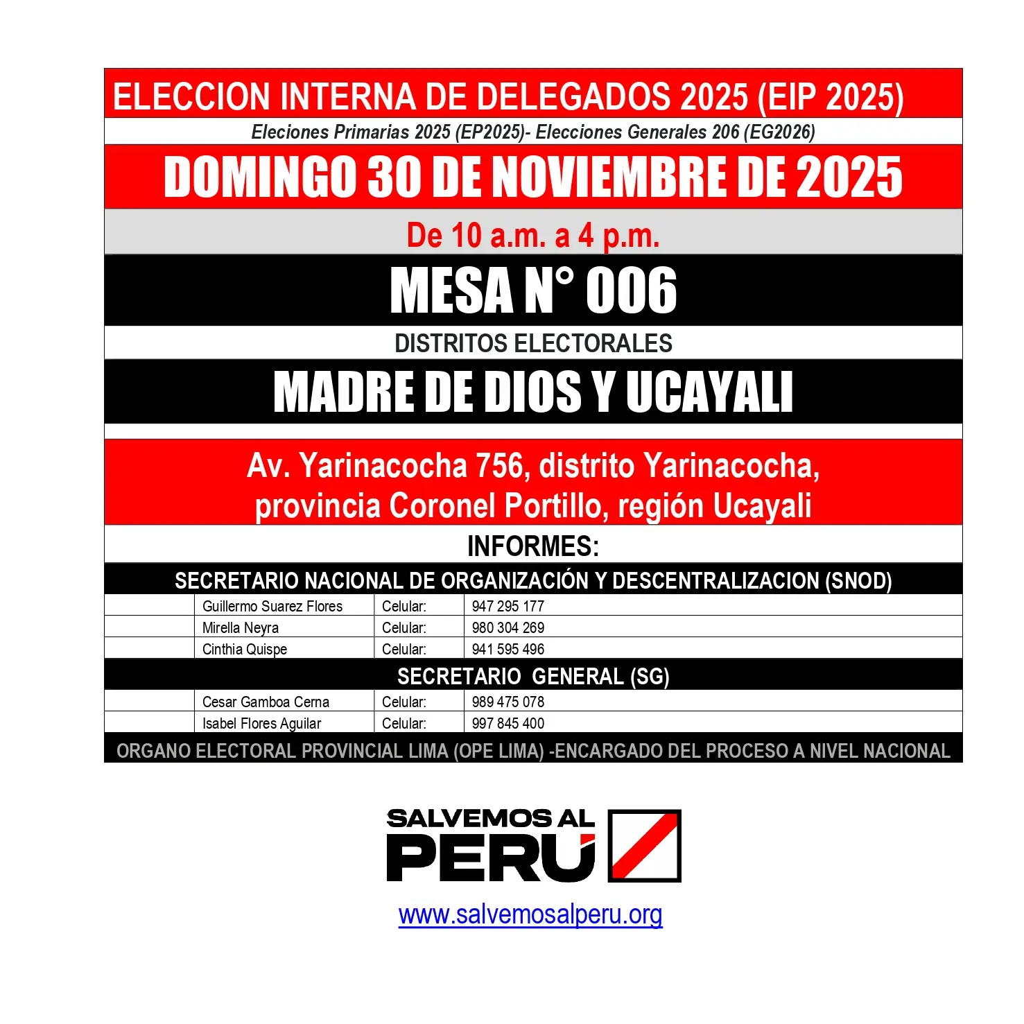 ORIENTE-1: MESA No 006 - Madre de Dios y Ucayali – elige 2 delegados.