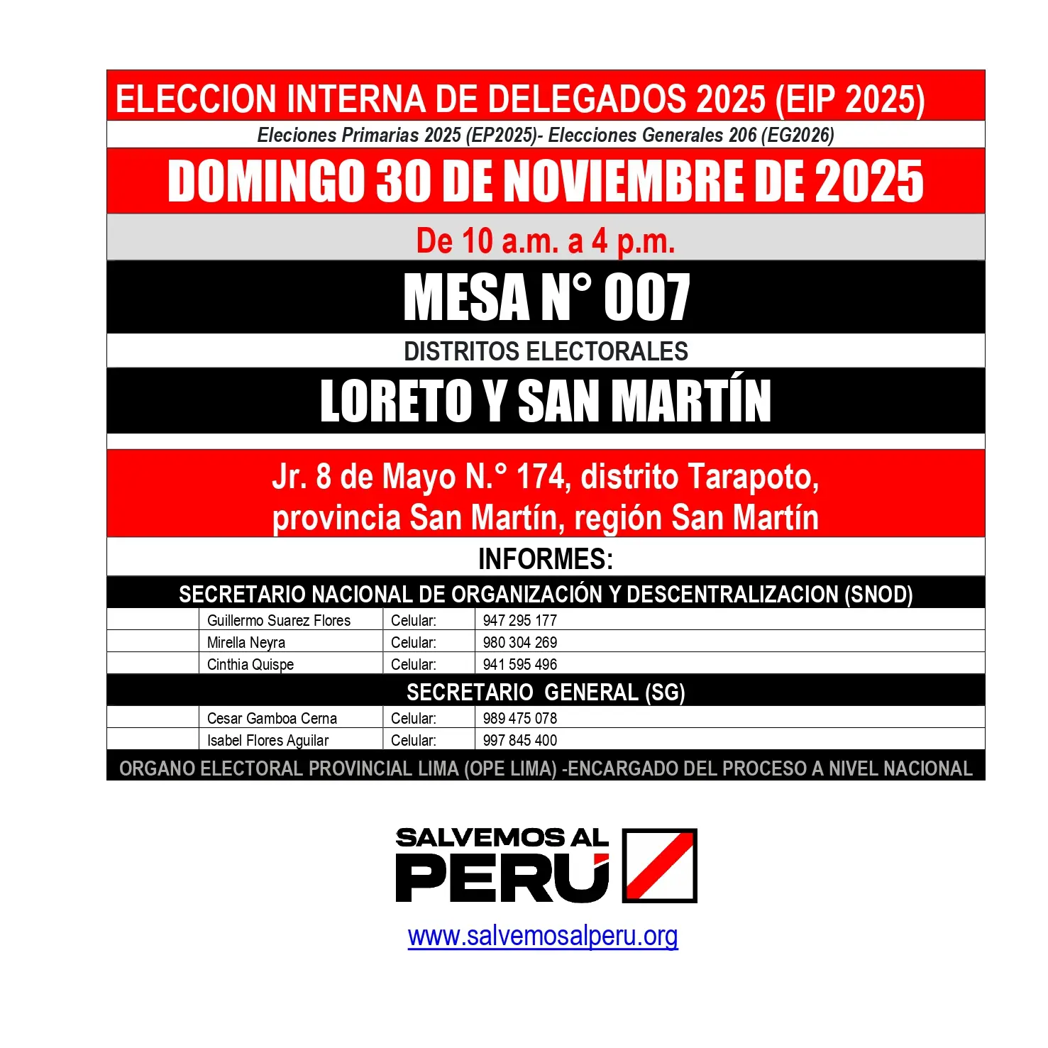 ORIENTE-2: MESA No. 007 - Loreto y San Martín – elige 2 delegados.