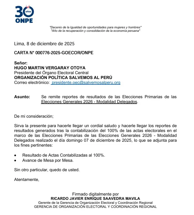 El Órgano Electoral Nacional (OEN) del partido político “Salvemos al Perú” informa a la militancia y a la ciudadanía en general que, mediante Carta N.° 000776-2025-GOECOR/ONPE, de fecha 8 de diciembre de 2025, la Oficina Nacional de Procesos Electorales (ONPE) ha remitido de manera oficial los resultados de las Elecciones Primarias de las Elecciones Generales 2026 – Modalidad Delegados.