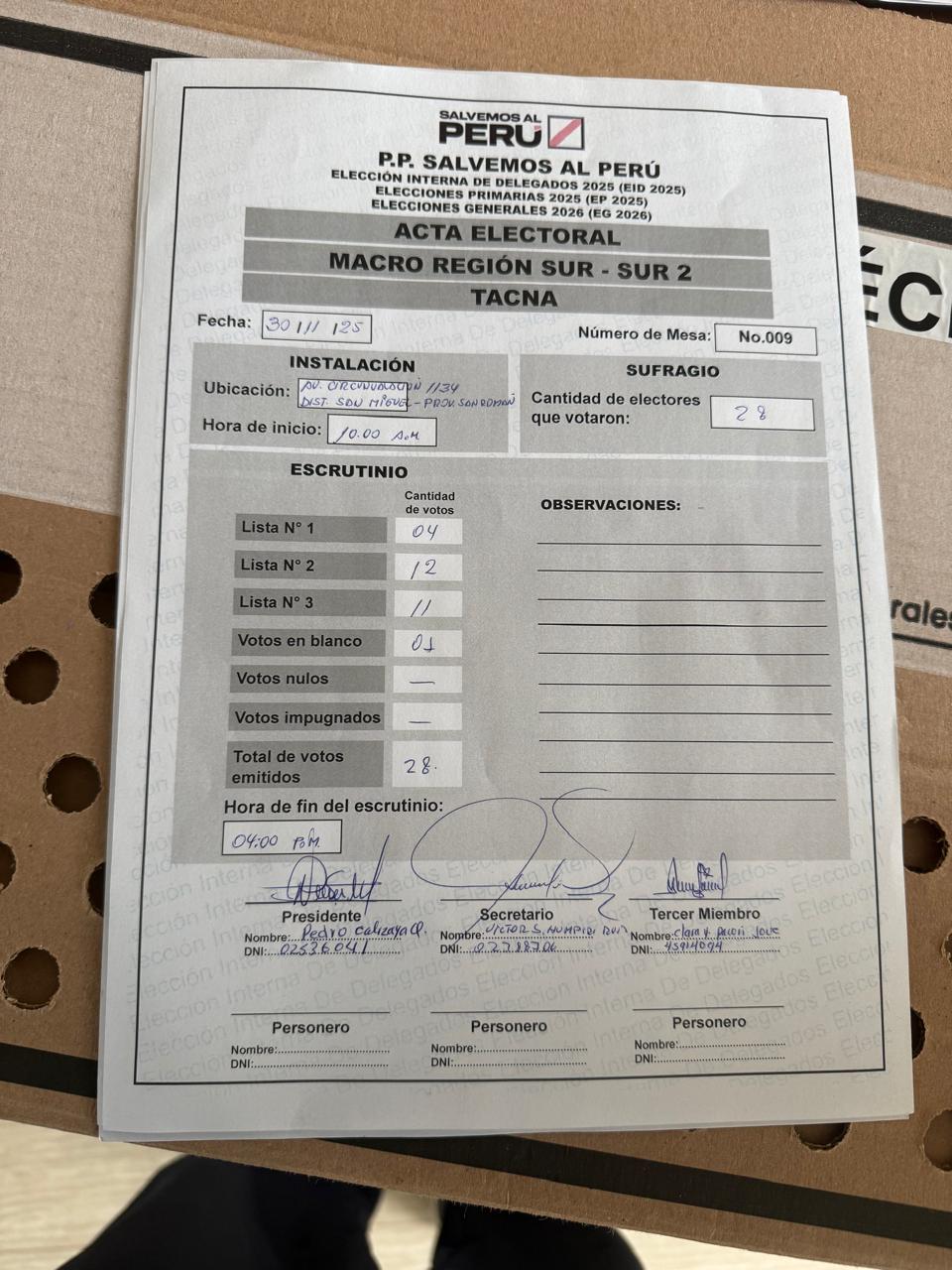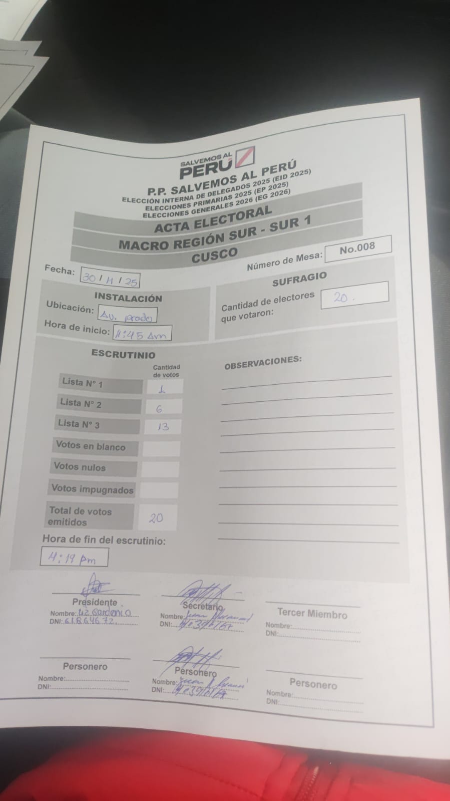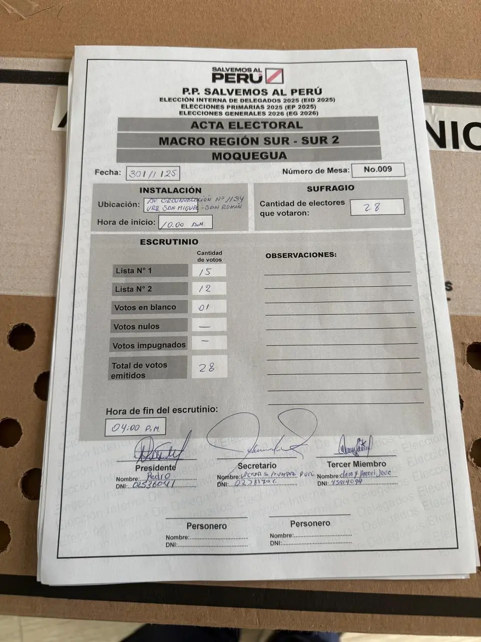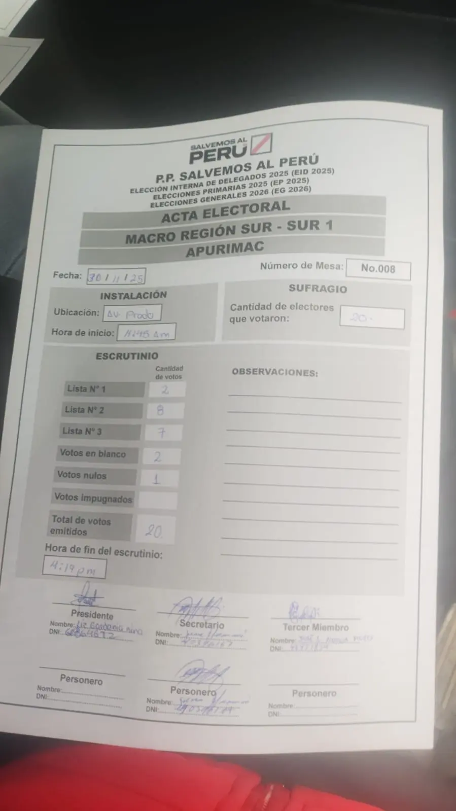 Las actas físicas originales suscritas por los miembros de mesa deben ser remitidas a la Oficina Principal del Órgano Electoral Provincial Lima (OEP-LIMA) ante del 3 de Diciembre del 2025 , fecha límite para la aprobación y proceda el Órgano Electoral Nacional (OEN) con el registro de los delegados en la plataforma de la ONPE , para que los Delegados Electores, participen en las elecciones primarias 2025 del 07 de Diciembre próximo.