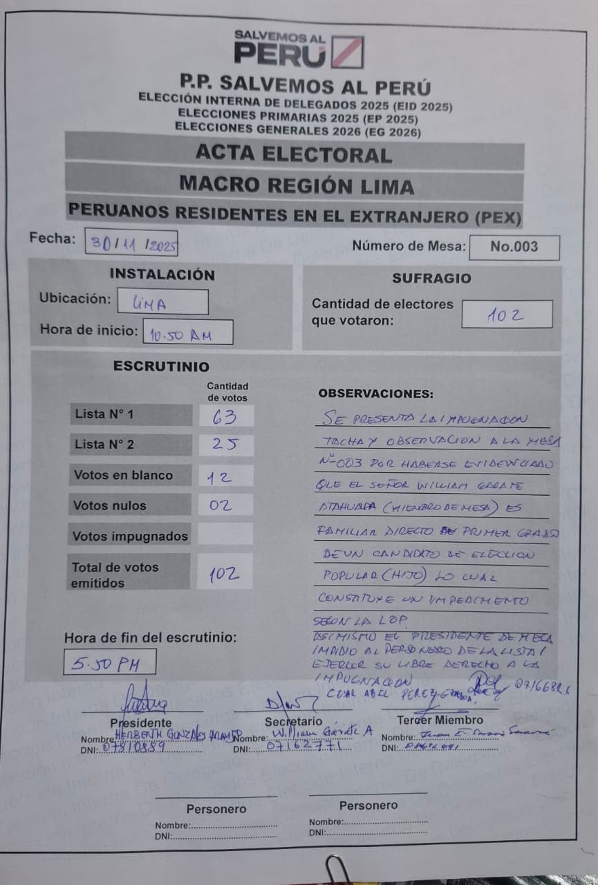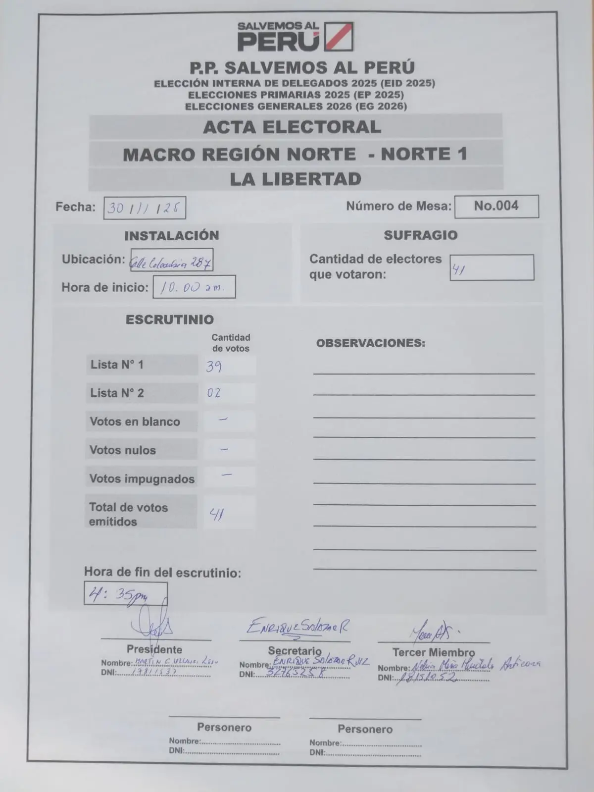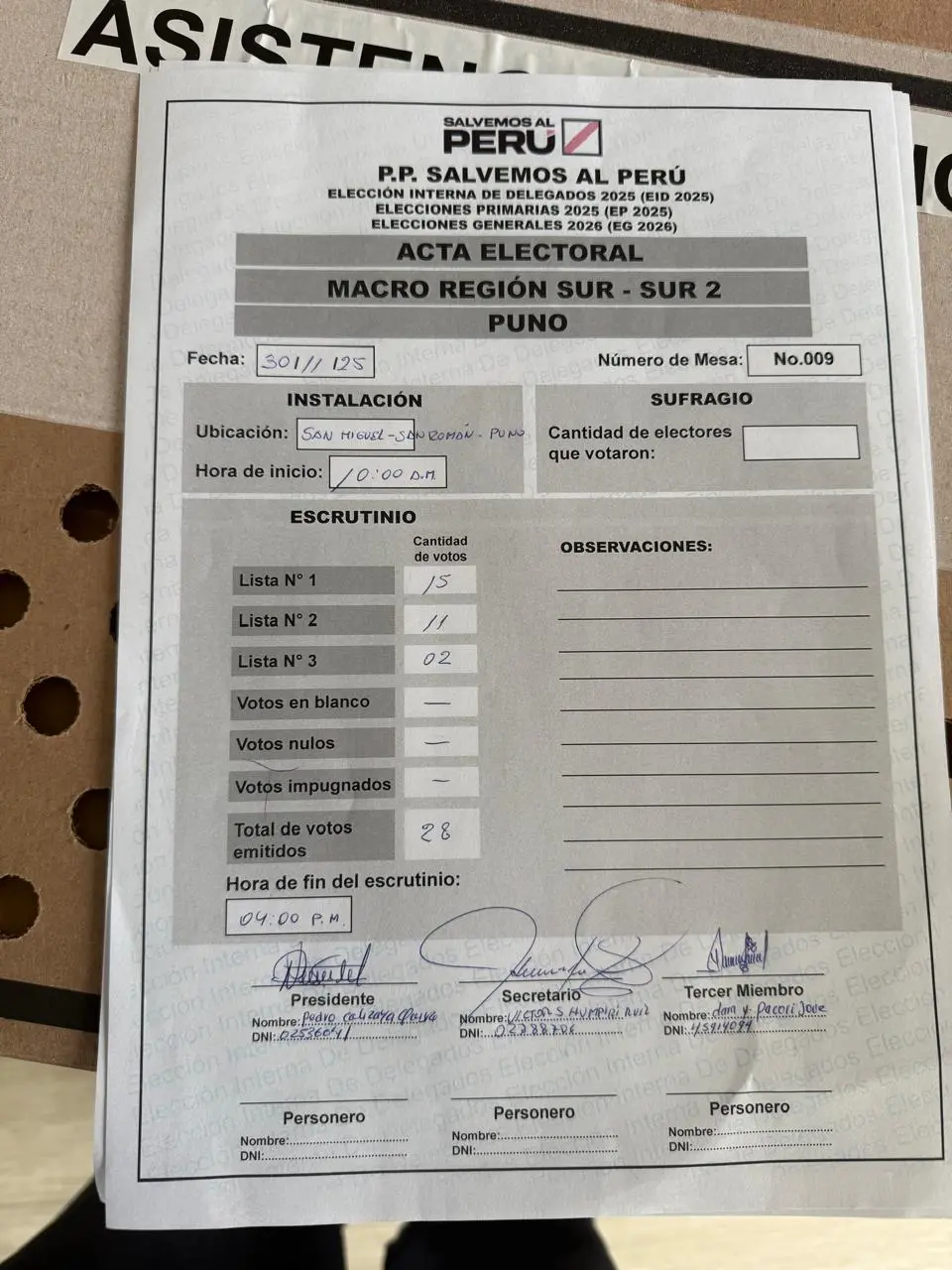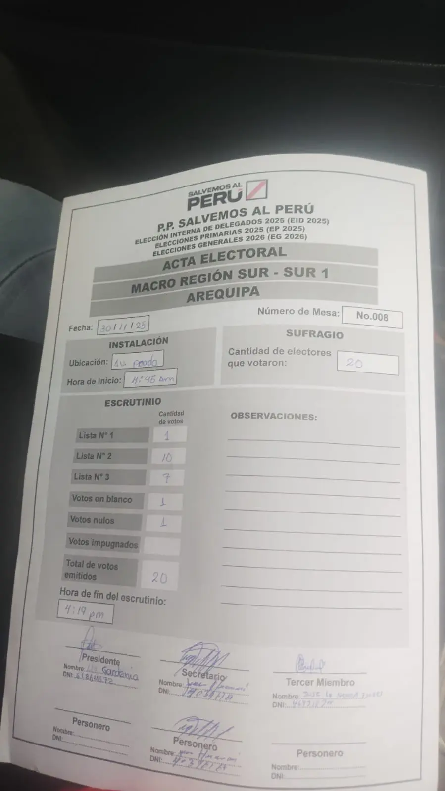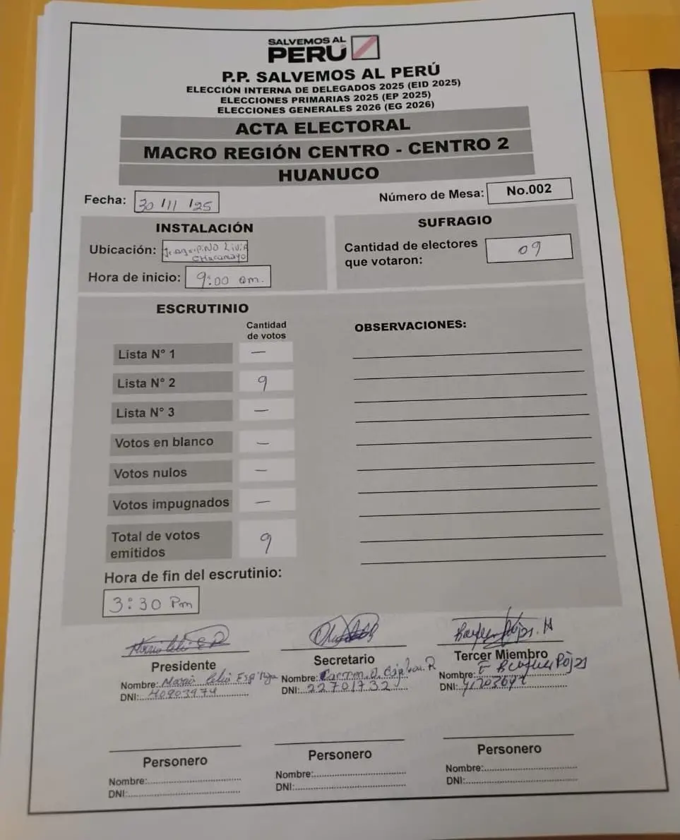 Las actas físicas originales suscritas por los miembros de mesa deben ser remitidas a la Oficina Principal del Órgano Electoral Provincial Lima (OEP-LIMA) ante del 3 de Diciembre del 2025 , fecha límite para la aprobación y proceda el Órgano Electoral Nacional (OEN) con el registro de los delegados en la plataforma de la ONPE , para que los Delegados Electores, participen en las elecciones primarias 2025 del 07 de Diciembre próximo.