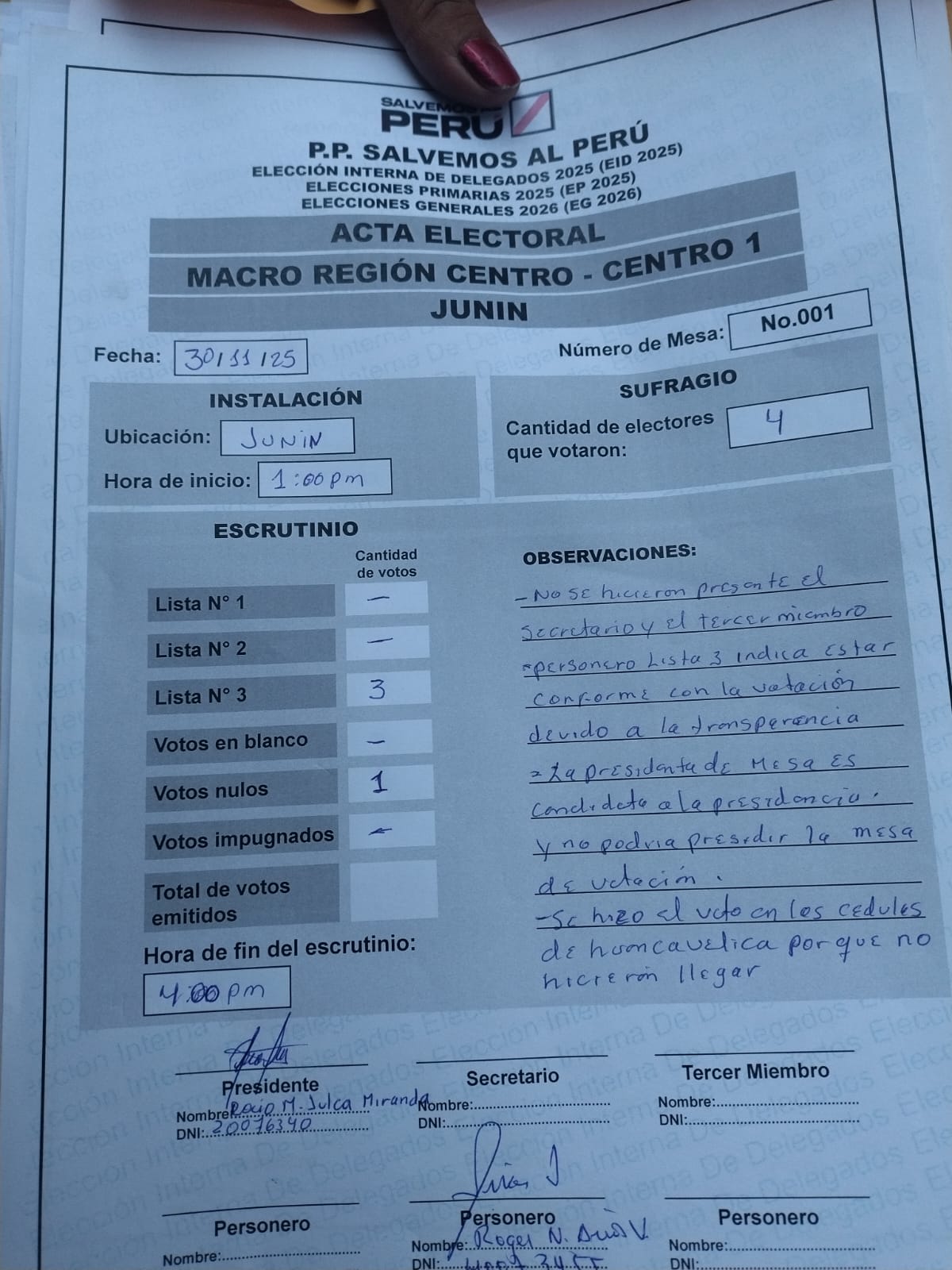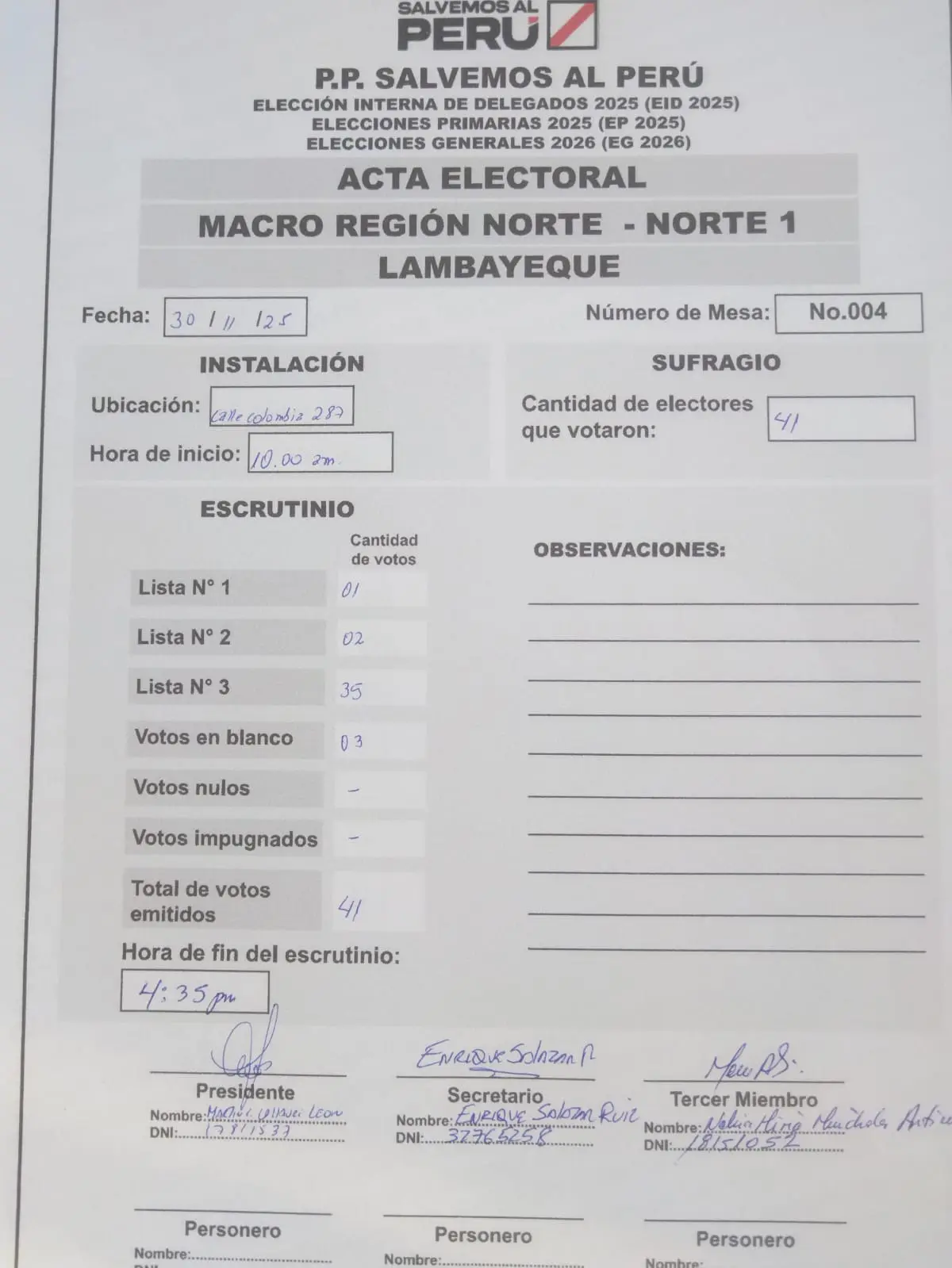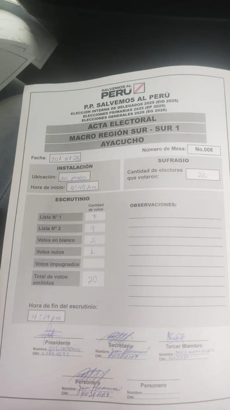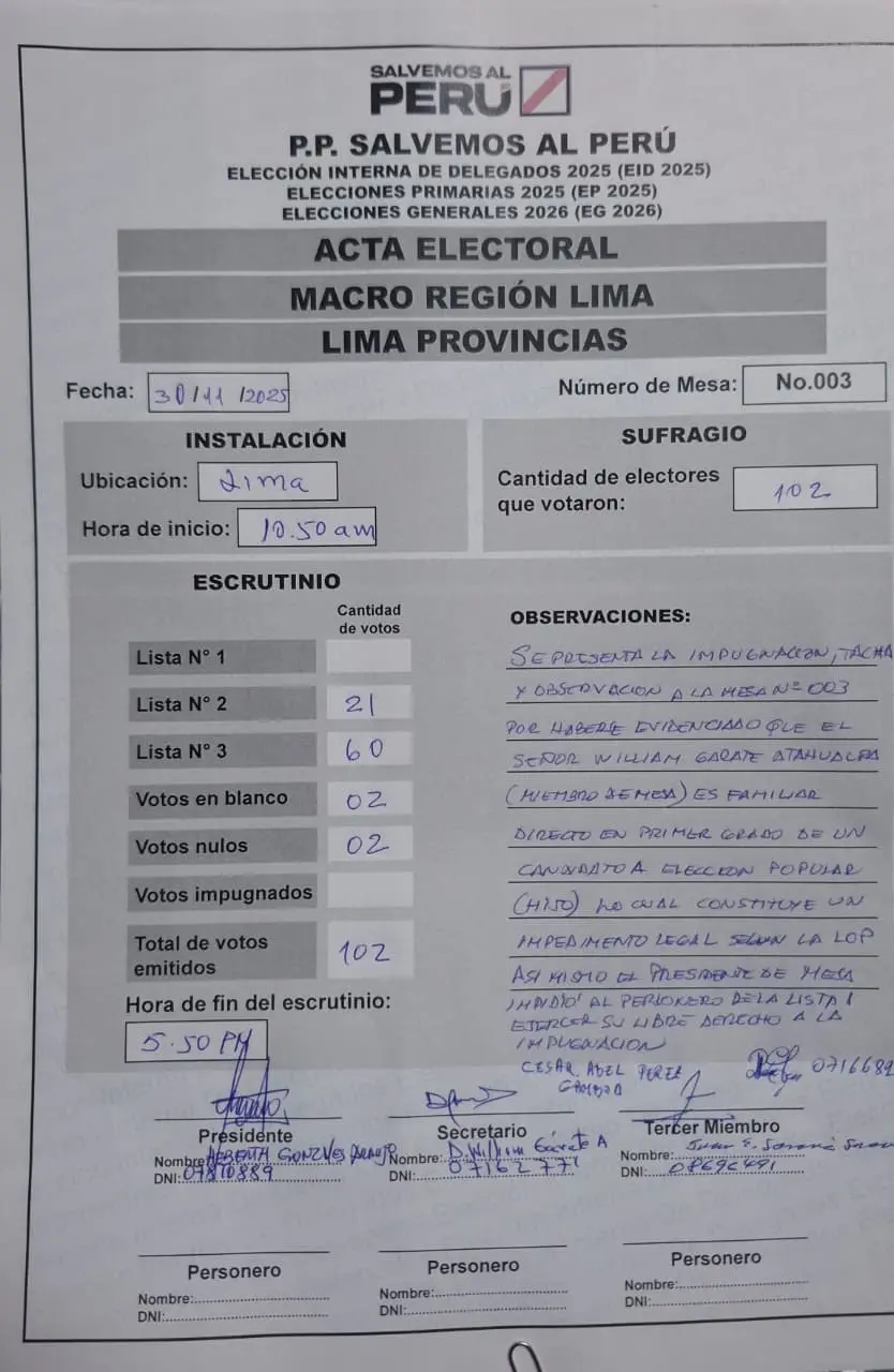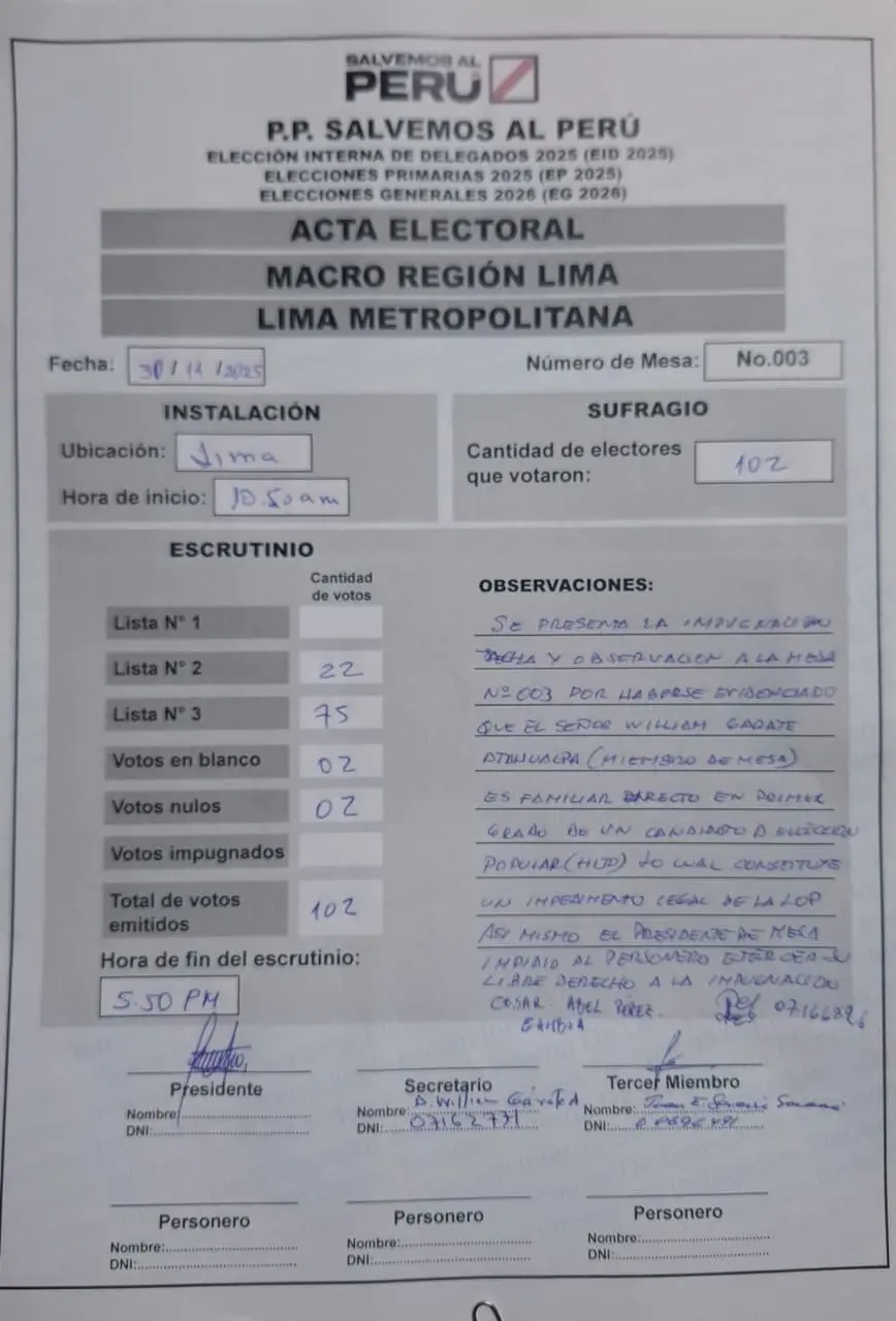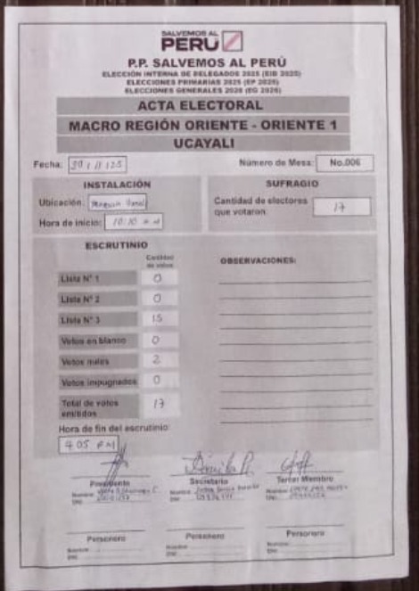 Las actas físicas originales suscritas por los miembros de mesa deben ser remitidas a la Oficina Principal del Órgano Electoral Provincial Lima (OEP-LIMA) ante del 3 de Diciembre del 2025 , fecha límite para la aprobación y proceda el Órgano Electoral Nacional (OEN) con el registro de los delegados en la plataforma de la ONPE , para que los Delegados Electores, participen en las elecciones primarias 2025 del 07 de Diciembre próximo.