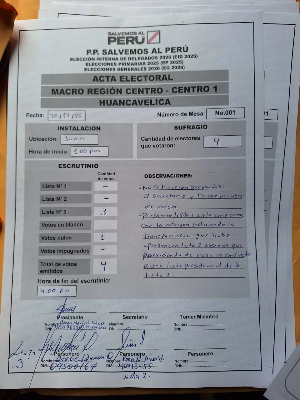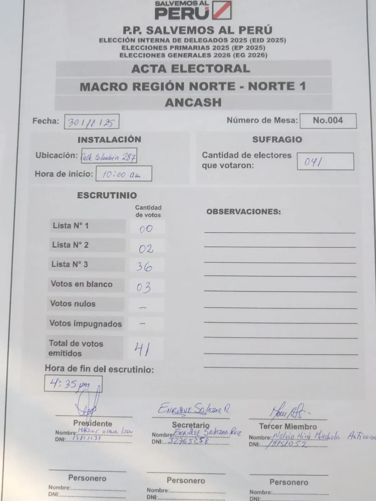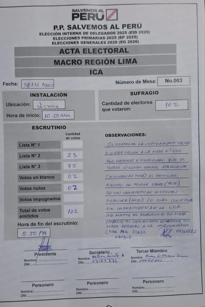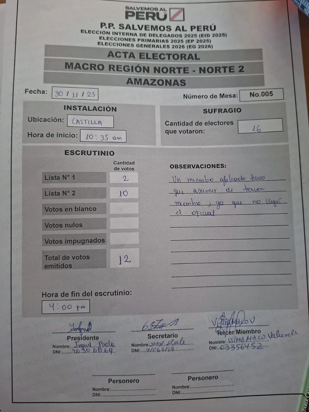 Las actas físicas originales suscritas por los miembros de mesa deben ser remitidas a la Oficina Principal del Órgano Electoral Provincial Lima (OEP-LIMA) ante del 3 de Diciembre del 2025 , fecha límite para la aprobación y proceda el Órgano Electoral Nacional (OEN) con el registro de los delegados en la plataforma de la ONPE , para que los Delegados Electores, participen en las elecciones primarias 2025 del 07 de Diciembre próximo.