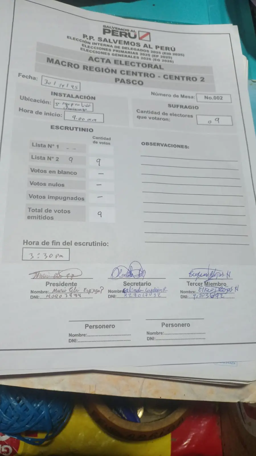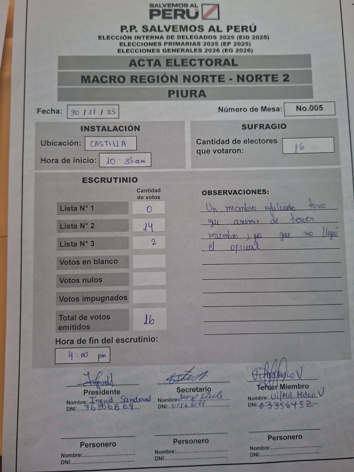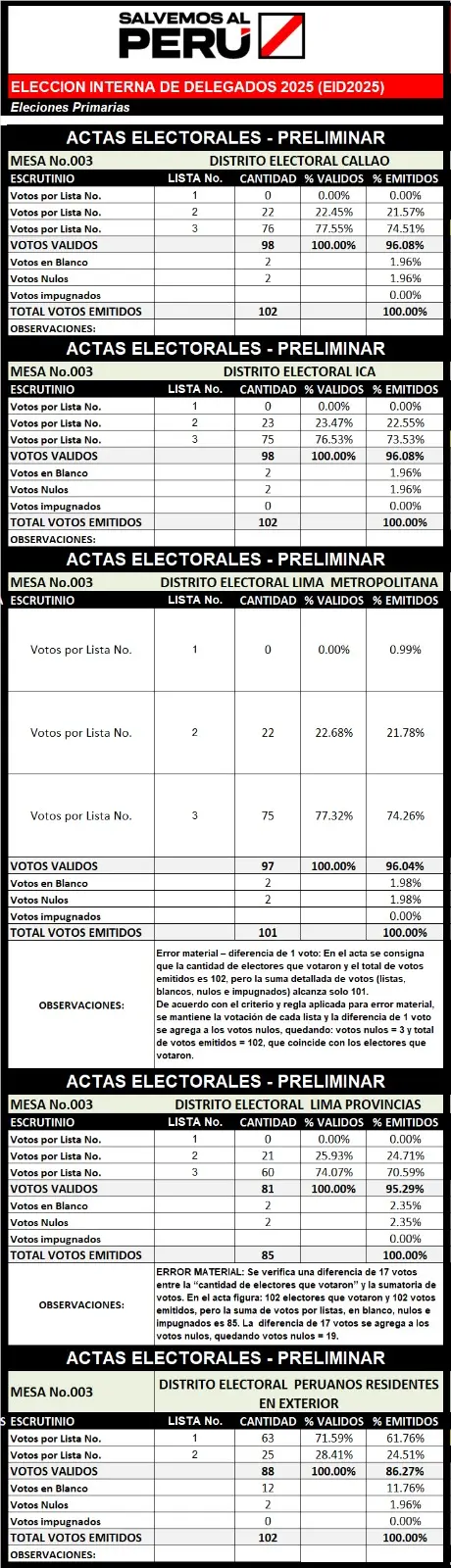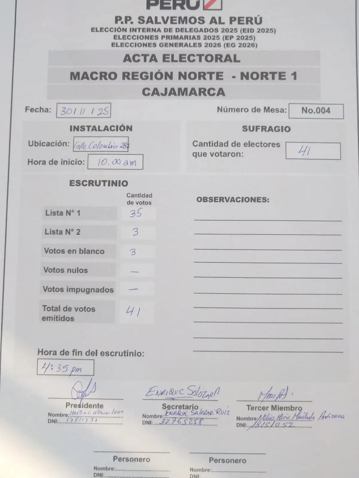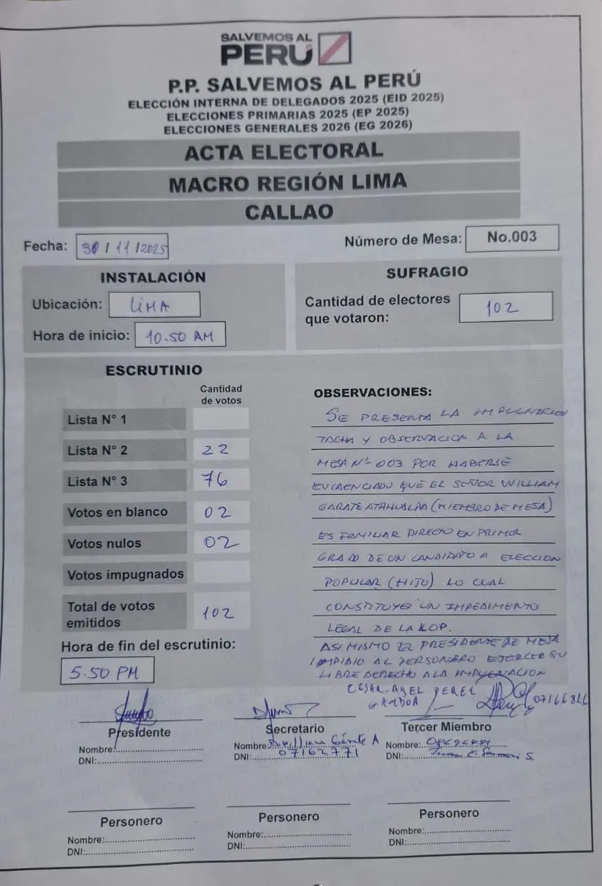 Las actas físicas originales suscritas por los miembros de mesa deben ser remitidas a la Oficina Principal del Órgano Electoral Provincial Lima (OEP-LIMA) ante del 3 de Diciembre del 2025 , fecha límite para la aprobación y proceda el Órgano Electoral Nacional (OEN) con el registro de los delegados en la plataforma de la ONPE , para que los Delegados Electores, participen en las elecciones primarias 2025 del 07 de Diciembre próximo.