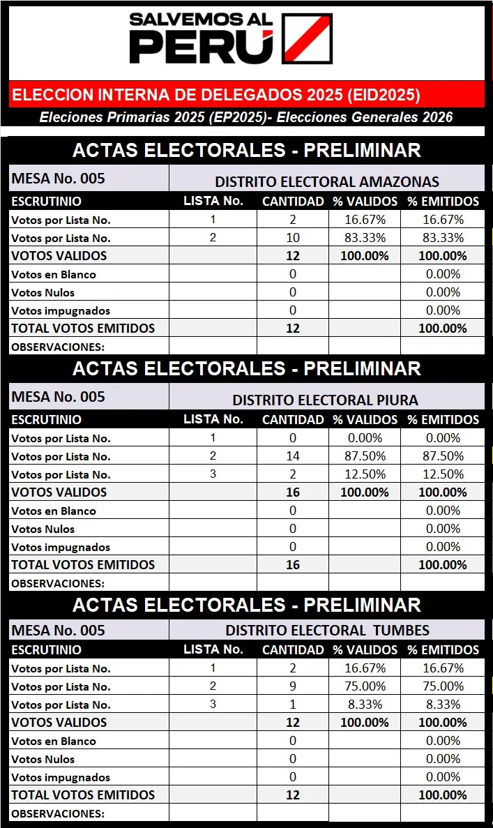 NORTE-2: MESA No. 005 - Amazonas, Piura y Tumbes – elige 3 delegados.
