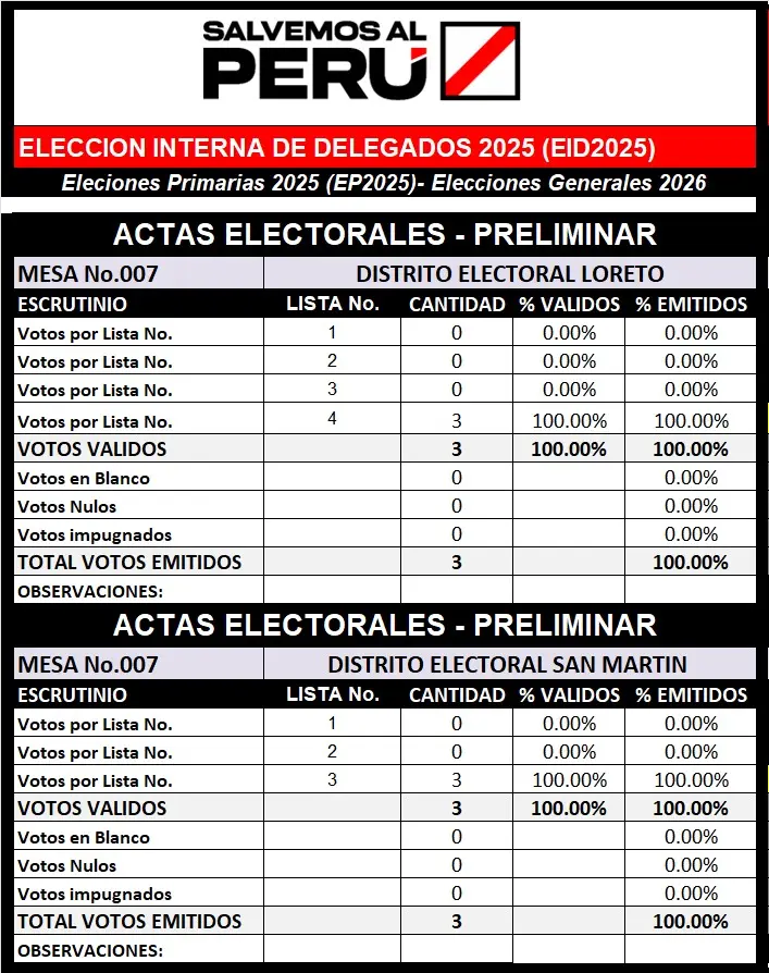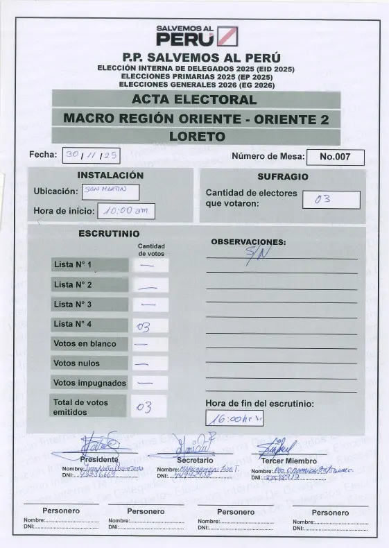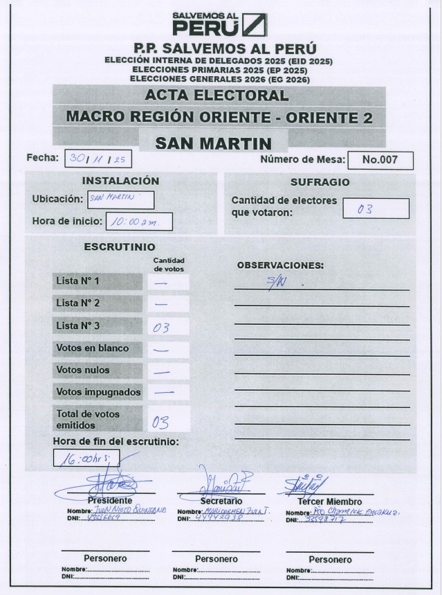 ORIENTE-2: MESA No. 007 - Loreto y San Martín – elige 2 delegados.