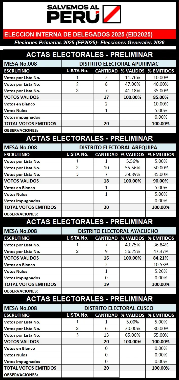 SUR-1: MESA No. 008 - Apurímac, Arequipa, Ayacucho y Cusco – elige 4 delegados.
