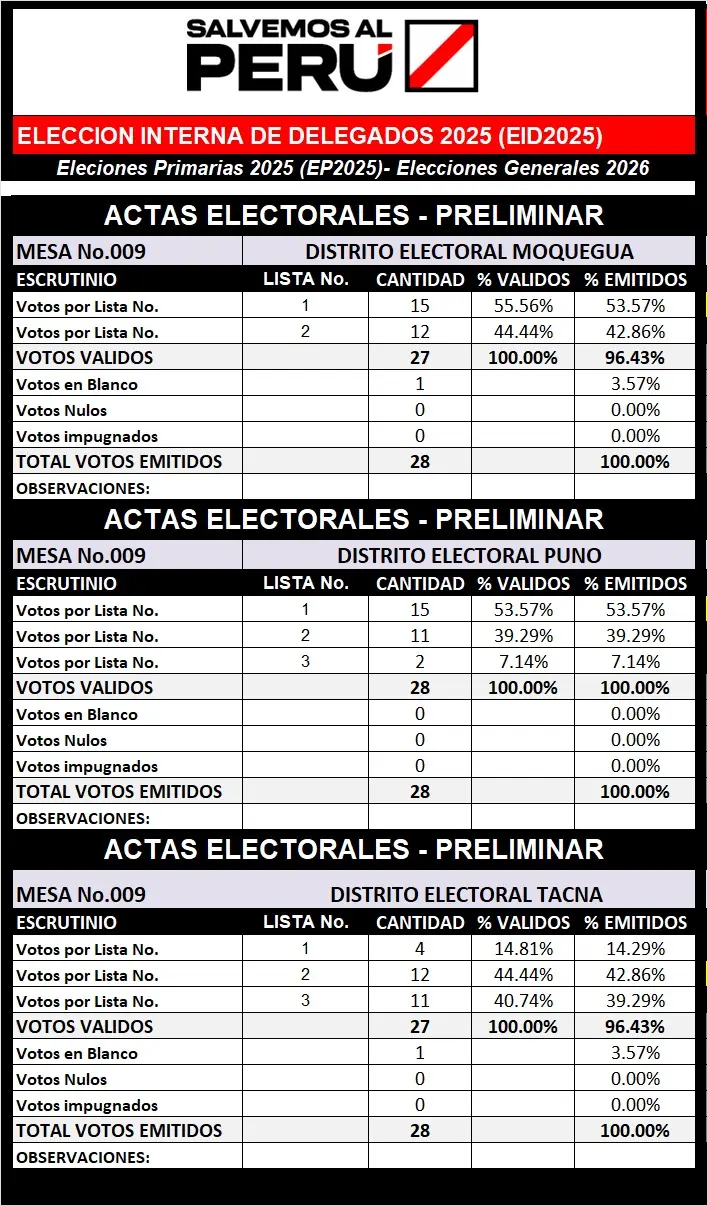 SUR-2: MESA No. 009 - Moquegua, Puno y Tacna – elige 3 delegados.
