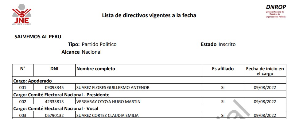 En ese sentido, se hace de conocimiento para los fines correspondientes que el Órgano Electoral Central (OEC) del Partido Político Salvemos al Perú corresponde al denominado Órgano Electoral Nacional (OEN), conforme a su Estatuto y Reglamento Electoral vigentes. Asimismo, se precisa que el Presidente Titular del OEN, debidamente inscrito en el Registro de Organizaciones Políticas (ROP), es el señor HUGO MARTÍN VERGARAY OTOYA, quien se encuentra en ejercicio de sus funciones. Por tanto, no corresponde que quien figura únicamente como Presidente Suplente actúe en representación del OEN ni promueva actuaciones paralelas junto a personas ajenas al órgano electoral que no se encuentran registradas ante la DNROP–JNE. 📎 Referencia: Registro de Organizaciones Políticas (ROP) – https://sroppublico.jne.gob.pe/Consulta/OrganizacionPolitica