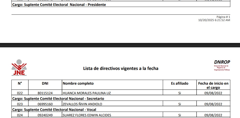 OFICIO | 5221-2025-DNROP-JNE | 17/09/2025 | Jurado Nacional de Elecciones (JNE), a través de la Dirección Nacional de Registro de Organizaciones Políticas (DNROP), emitió el Oficio N.º 5221-2025-DNROP-JNE en atención al Expediente N.º 2025-000059046, dando respuesta a la comunicación de la Oficina Nacional de Procesos Electorales (ONPE) —Oficio N.º 028-2025-GOECOR-ONPE, vinculado al Expediente N.º 56152-2025— hace referencia a la verificación de los estatutos y reglamentos electorales vigentes del Partido Político Salvemos al Perú, inscritos ante el Registro de Organizaciones Políticas (ROP), los cuales constituyen la base legal para el desarrollo del proceso de Elecciones Primarias 2025 y la elección de candidatos para las Elecciones Generales 2026 (EG2026). |