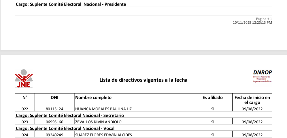 | 6 | Vocal Suplente | EDWIN ALCIDES SUÁREZ FLORES | 09240249 | Figura inscrito como suplente en el ROP. |